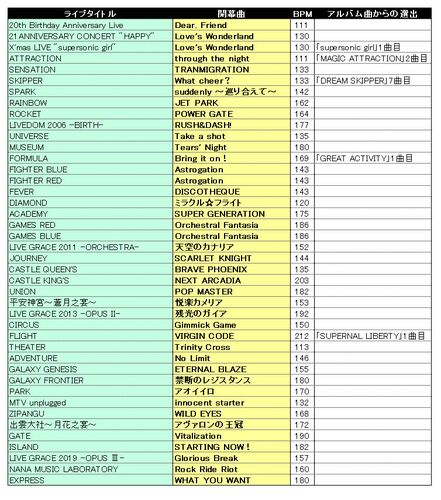 2019年10月3日にツイッターに投稿した調査。 水樹奈々さんのライブでは、開幕曲は重複しません(ただし、2001年に行われた「 21ANNIVERSARY CONCERT "HAPPY"」「X'mas LIVE "supersonic girl"」は二つとも開幕曲が「Love's Wonderland」。) この事実に基づい…