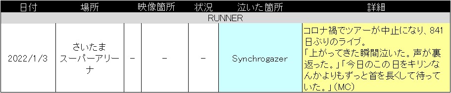 -…映像収録されておらず映像では確認できないが、水樹奈々さん本人の発言又はそのライブに参加した複数のファンの情報により泣いたことが事実上確定できるもの。