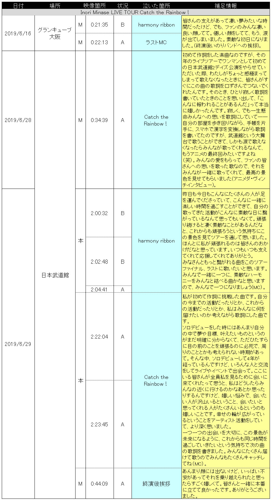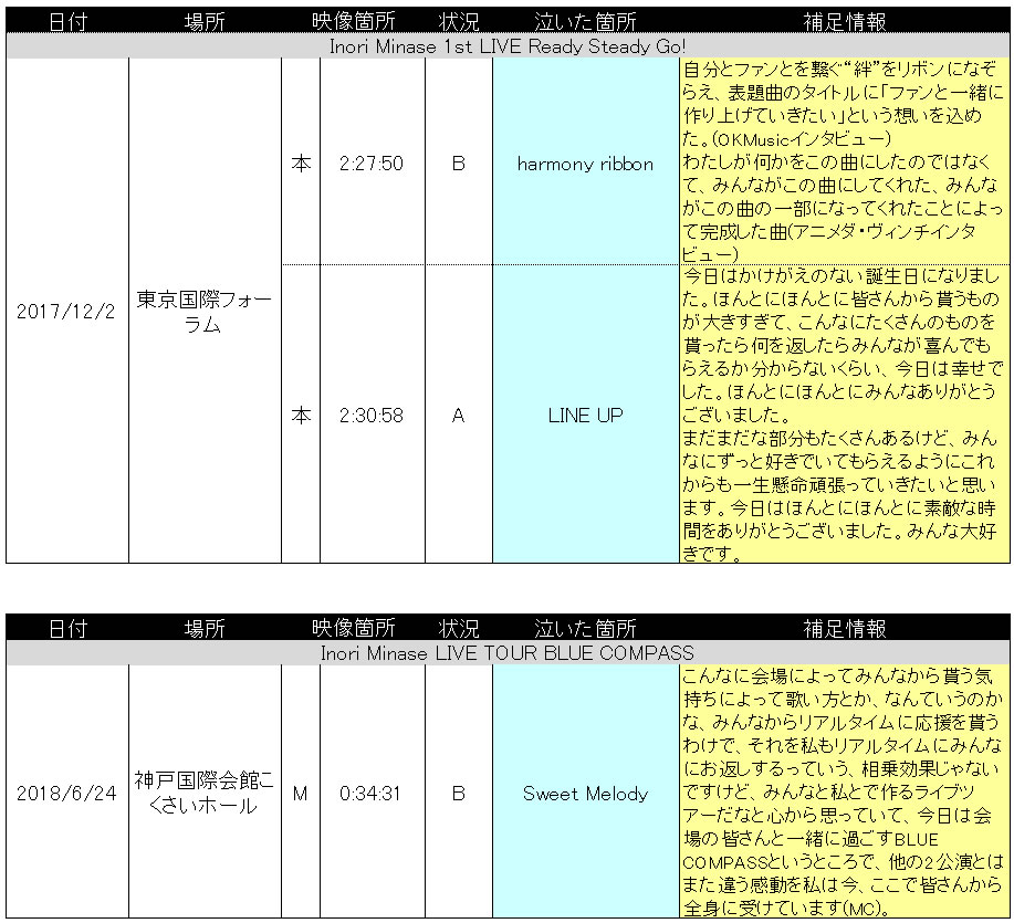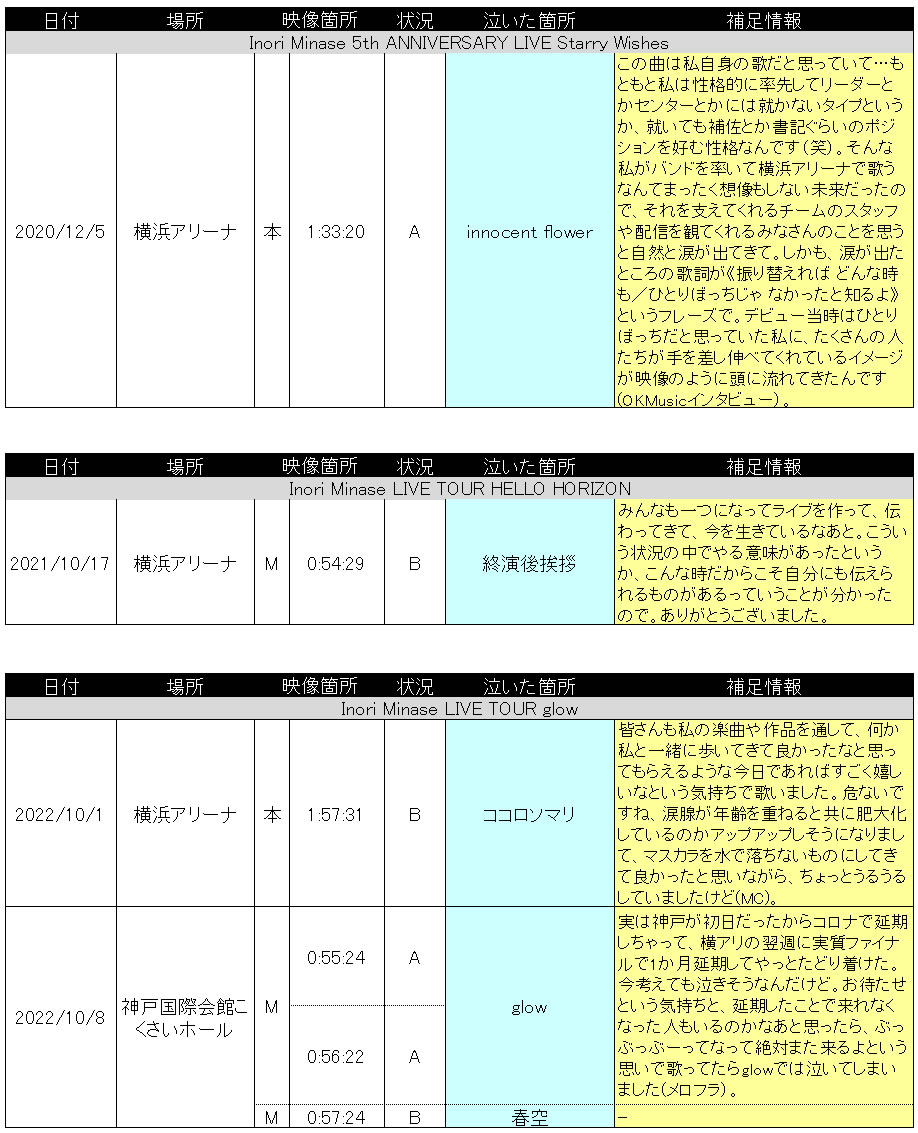 水瀬いのりさんが今までのライブで泣いた、あるいは感極まったシーンをまとめてみました。補足情報として、泣いたシーンの前後のMC、泣いたシーンに関して言及したインタビューやラジオの発言なども記載しております。